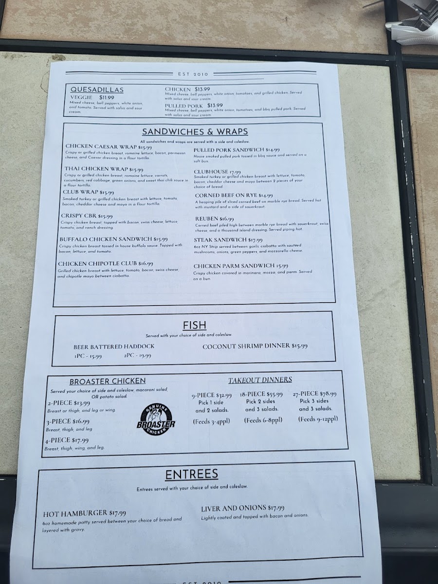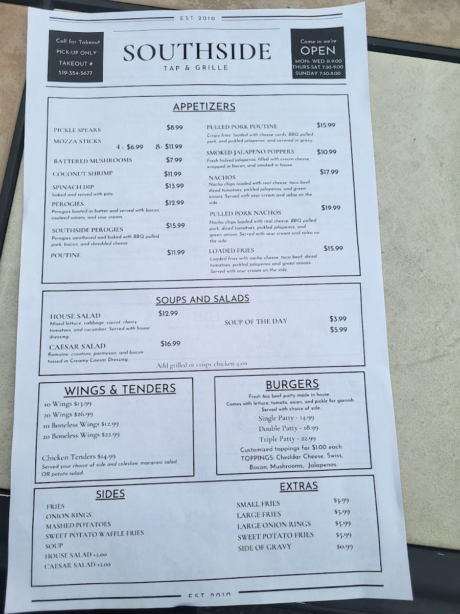 You’ll find hearty options like Broaster Chicken with Onion Rings and a comforting Beef Dip, alongside shareable appetizers such as Mozzarella Sticks and Southside Perogies. Perfect for any time of day, the menu also includes a Breakfast Plate for a simple start or lighter bites like a Chicken Caesar Wrap for midday enjoyment.